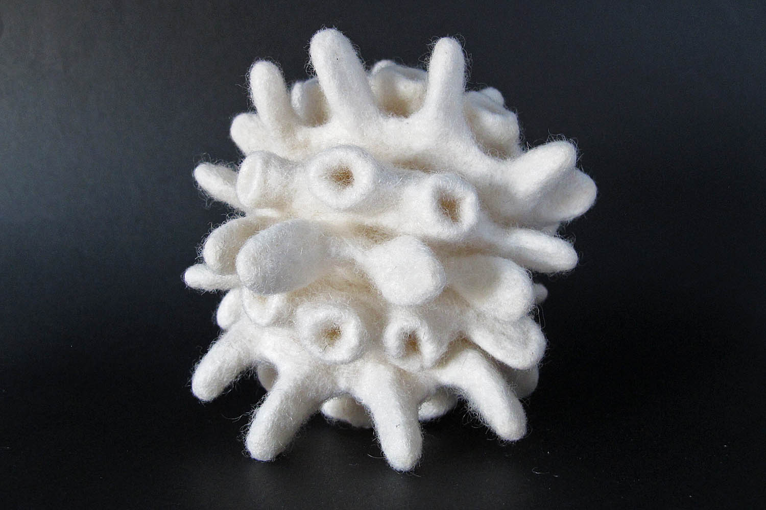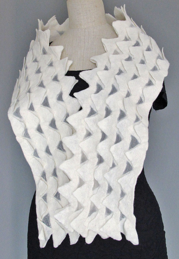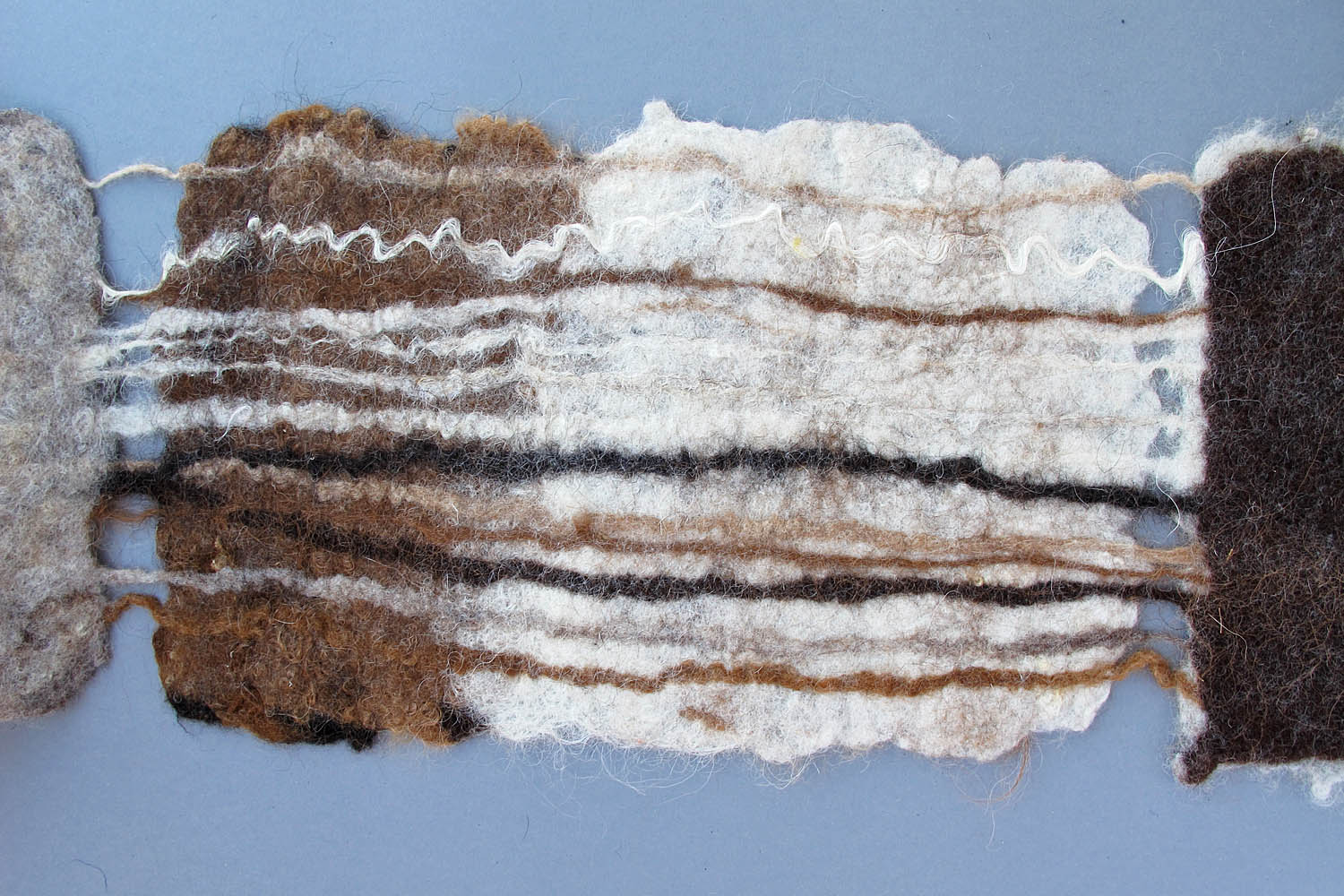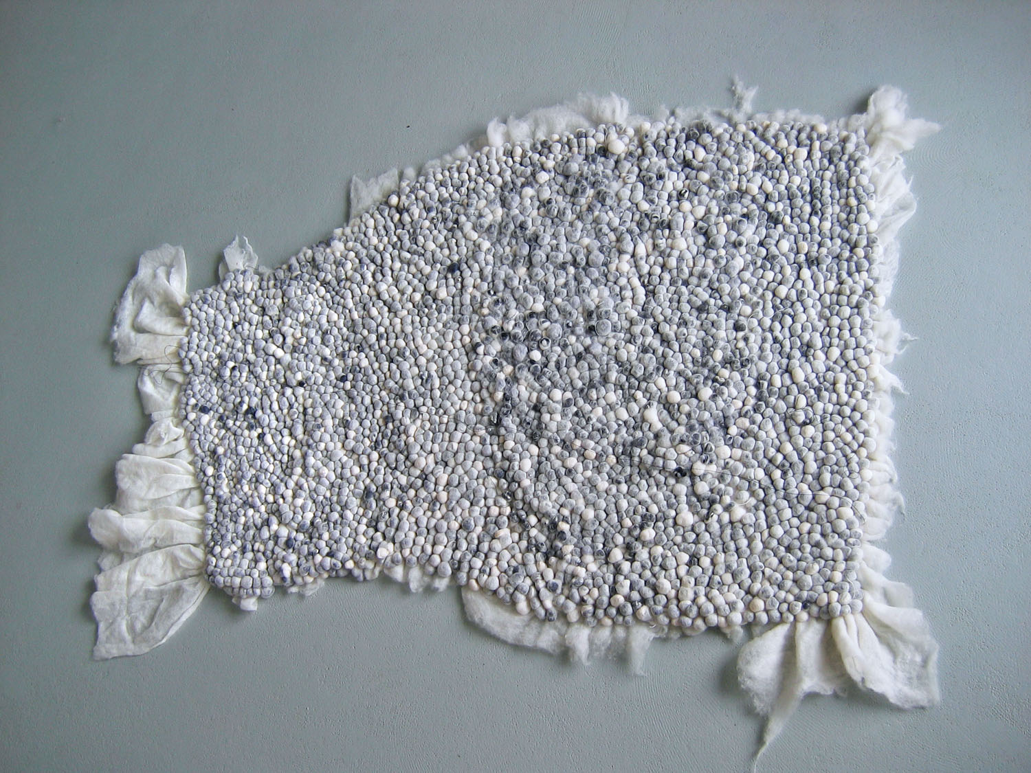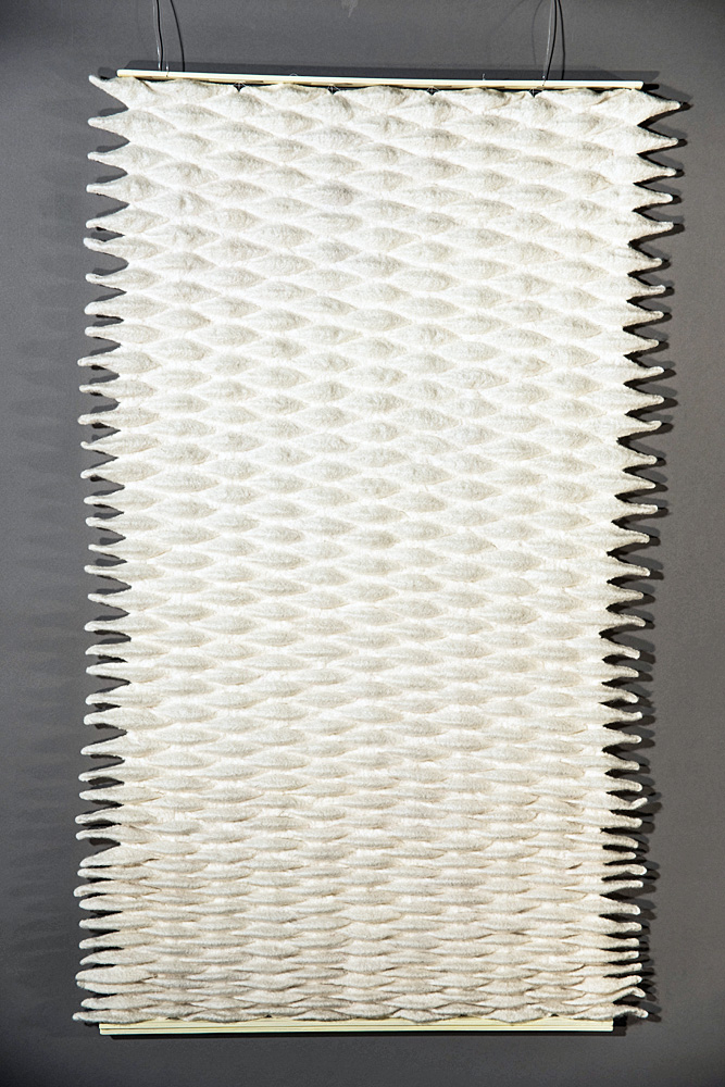 in den ersten jahren, als das filzhandwerk in unseren breitengraden wieder auflebte, war es ein sakrileg andere hilfsmittel ausser wolle, wasser, seife, und die hände, für die herstellung eines filz – objekts zu verwenden. mit dem aufweichen der einengenden regeln, erweiterten sich die grenzen des möglichen in der filzgestaltung. ich bewege mich gerne in diesen regionen, wo meine eigenen vorstellungsmöglichkeiten, meine fähigkeiten und das material die grenzen bestimmen.