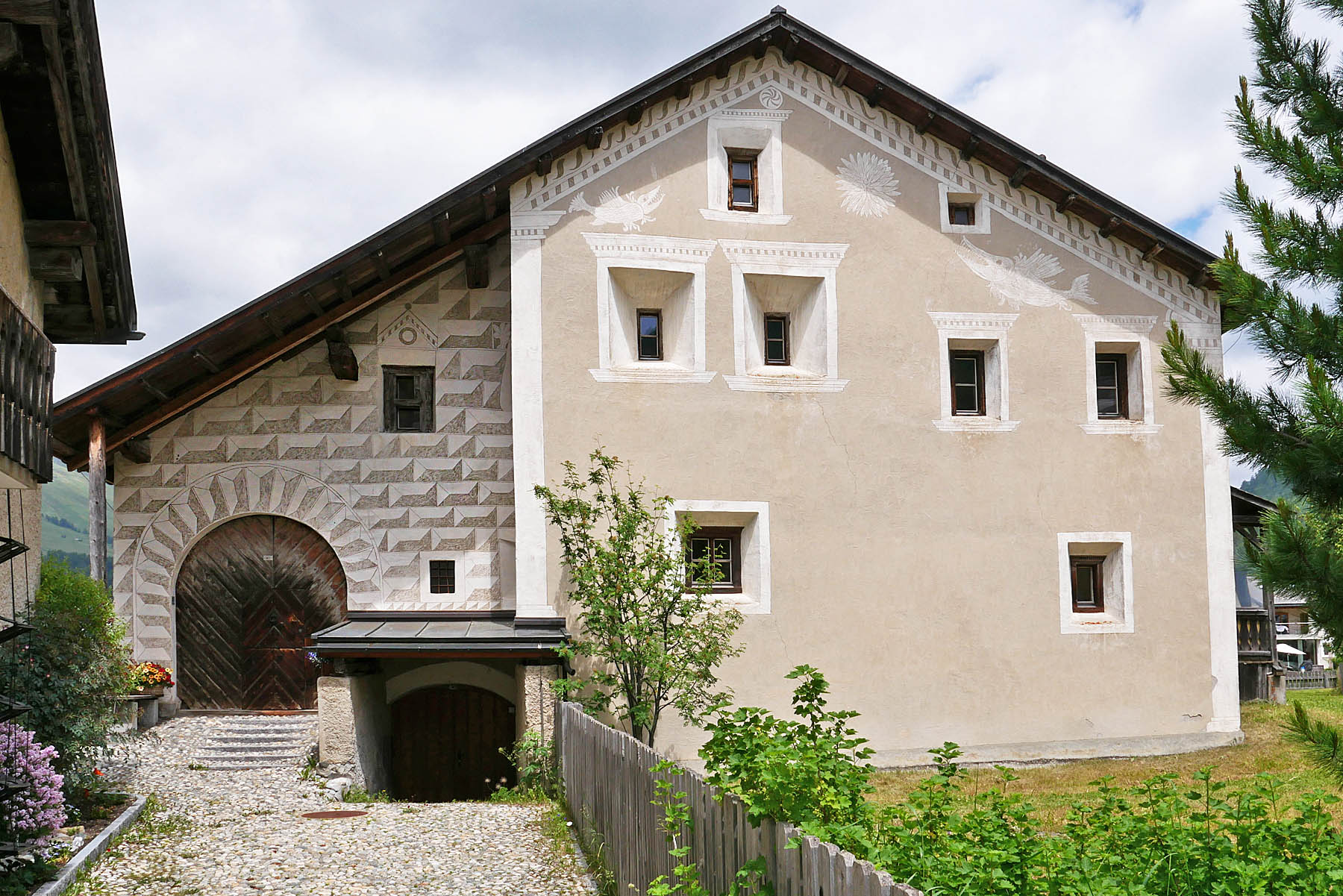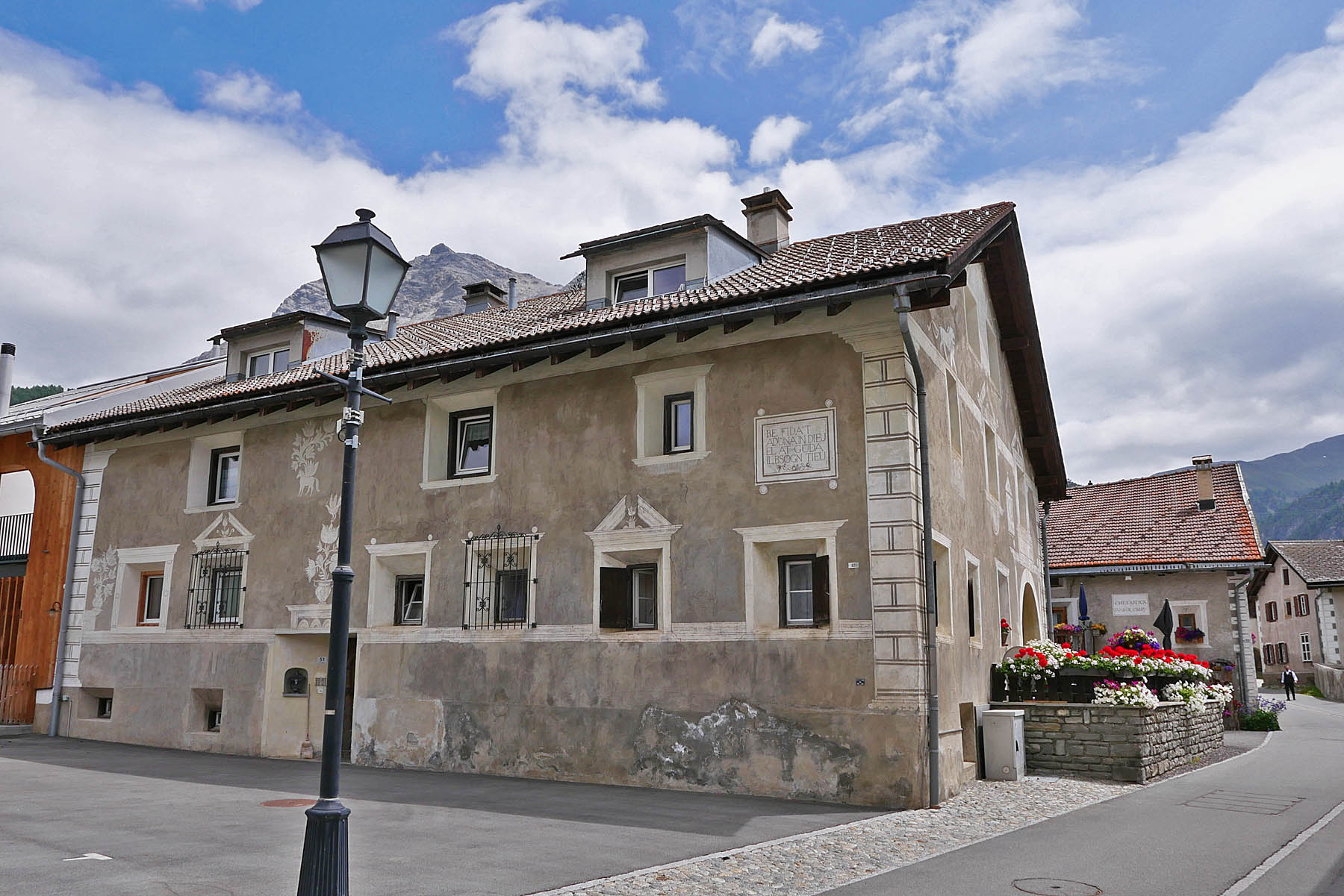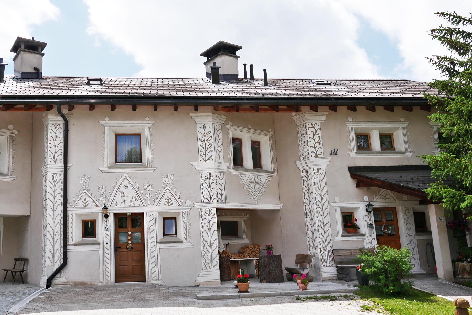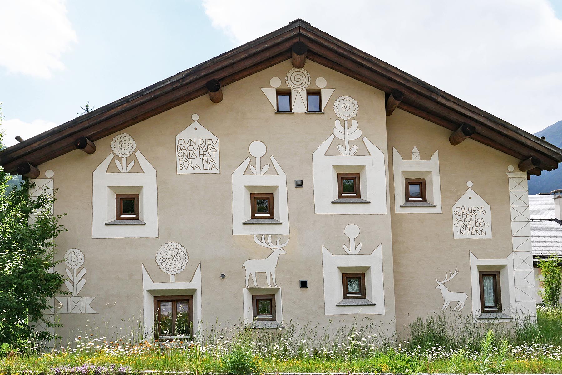 In Chamues-ch sind extrem viele wunderbare Engadinerhäuser mit den verschiedensten Sgraffiti zu finden. Sgraffiti sind in Kalk gekratzte Kunstwerke und Dekorationen, die aus Italien Eingang in das inneralpine Hochtal Engadin gefunden haben. Seit gut einem halben Jahrtausend wird diese Technik zum kulturellen und identitätsstiftenden Erbe des Engadins gezählt.